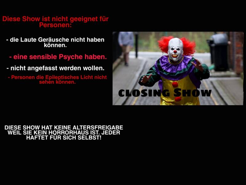 Dauer: 15 Minuten. (Startet dann genau am Parkschluss wenn alle Gäste raus sind und nur die die Escape from Horrorworld bestellt haben dürfen noch drin bleiben.)